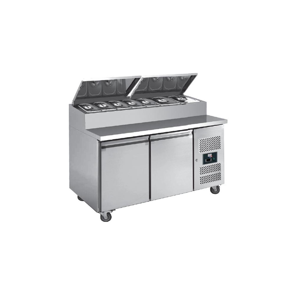 Construction inox intérieur et extérieur réfrigération assisstée, +2°c/+8°c, groupe logé couvercle inox (capacité 5 ou 8 gn1/6150 non fournis) plan de travail inox 3 portes avec fermeture automatique dotation : 1 niveau de glissières et 1 grille par porte dégivrage automatique isolation 35 mm (mousse polyuréthane) thermostat électronique dixell gaz réfrigérant : r600a