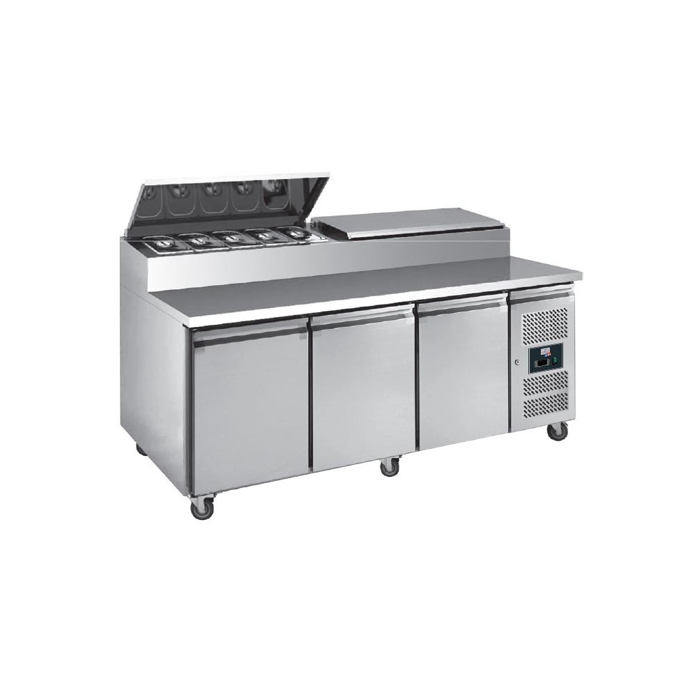 Construction inox intérieur et extérieur réfrigération ventilée +2°c/+8°c à 40°c, groupe logé plan de travail en inox et 2 couvercles inox (capacité 6 à 10 gn1/3 non fournis) 3 portes avec système de fermeture automatique dotation : 1 niveau de glissières et 1 grille par porte dégivrage automatique, isolation 50 mm (mousse polyuréthane) 4 roulettes dont 2 à freins ø 100 mm thermostat électronique dixell gaz réfrigérant : r290 capacité 8 gn1/3