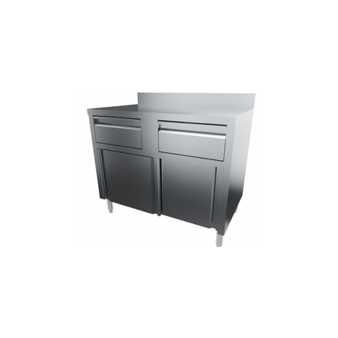 Construction inox ferritique ou inox aisi 304 dessus doublé mélaminé ép.18 mm 2 portes coulissantes doublées, sans clé sans étagère intermédiaire tiroirs h100 mm sur glissières zinguées dessus h43 mm hauteur 850 mm modèles adossés : dosseret doublé 100×20 mm avec décalage arrière de 60 mm