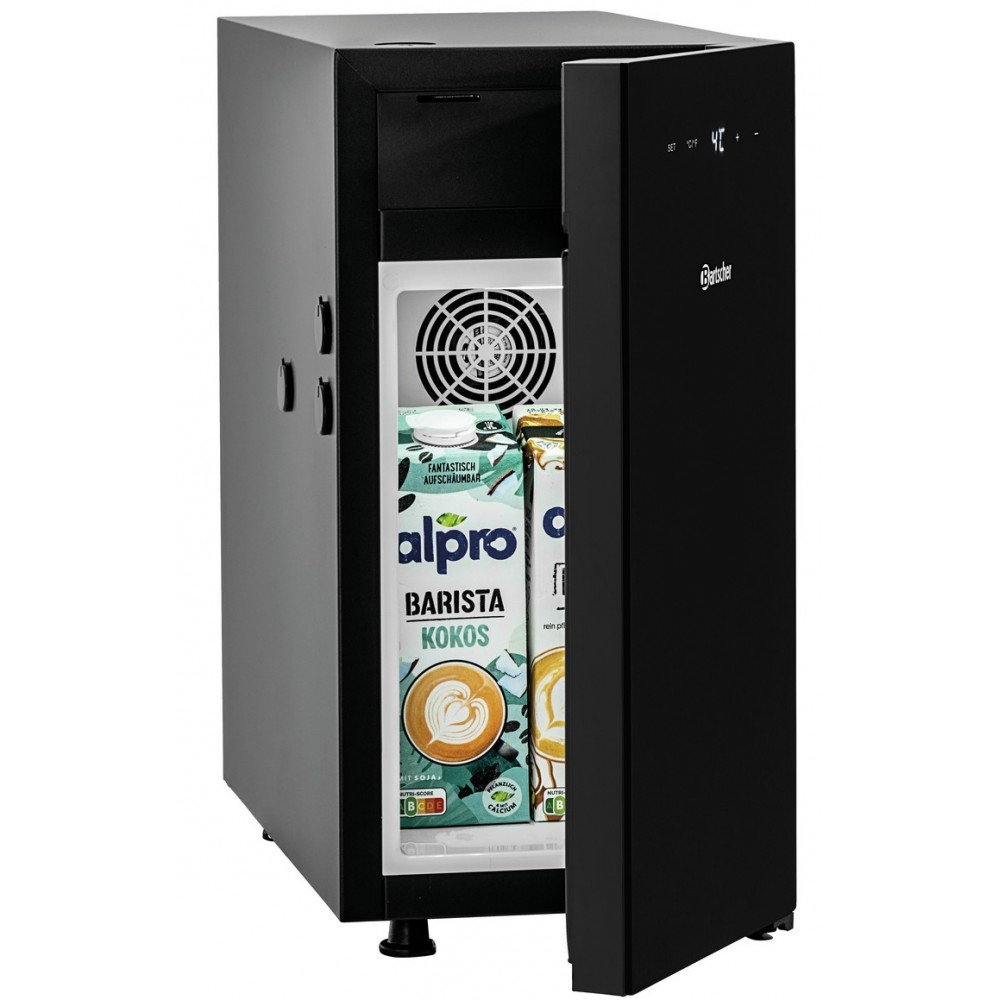 Pour le capuccino, le café au lait ou le latte macchiato - le réfrigérateur à lait pratique permet d'accéder directement à du lait froid grâce aux ouvertures latérales pour les tuyaux. Le lait est stocké au frais de manière hygiénique et peut être récupéré automatiquement par le tuyau à lait du distributeur automatique directement pour la préparation du café en cas de besoin.
