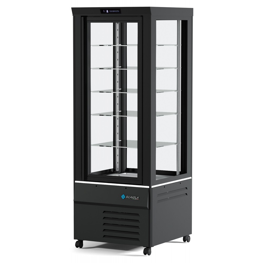 Compartiment d'exposition en verre trempé sérigraphié noir (RAL 9005). Ce verre haute performance thermique contient du gaz argon pour optimiser la luminosité et la visibilité des produits exposés. Porte vitrée à l'aspect résistant, poignée invisible pleine hauteur personnalisable en couleur RAL (en option). Évaporateur à grille statique avec dégivrage manuel. Gaz réfrigérant R290 purifié, non toxique et écologique.