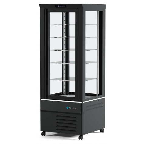 Température de fonctionnement +2/+10 °C – Réfrigération ventilée -Couleurs standard : Blanc-Argent-Noir   Compartiment d'exposition en verre trempé sérigraphié noir (RAL 9005). Ce verre à haute isolation thermique contient du gaz argon pour optimiser ses performances et garantir la brillance et la visibilité optimales des produits exposés. Porte vitrée avec poignée invisible toute hauteur, personnalisable en couleur RAL (en option). Dégivrage automatique et utilisation de gaz réfrigérant R290 purifié