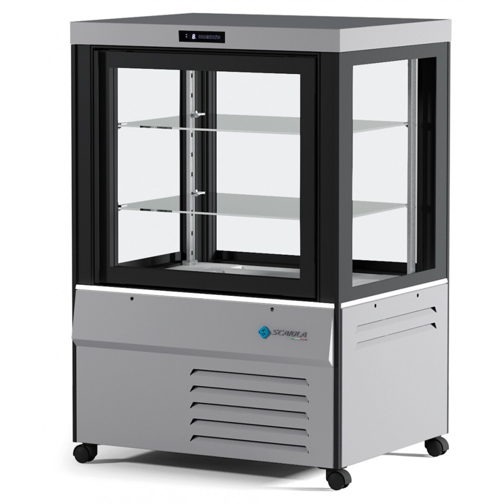 Température de fonctionnement +2/+10 °C – Réfrigération ventilée -Couleurs standard : Blanc-Argent-Noir   Compartiment d'exposition en verre trempé sérigraphié noir (RAL 9005). Ce verre à haute isolation thermique contient du gaz argon pour optimiser ses performances et garantir la brillance et la visibilité optimales des produits exposés. Porte vitrée avec poignée invisible toute hauteur, personnalisable en couleur RAL (en option). Dégivrage automatique et utilisation de gaz réfrigérant R290 purifié